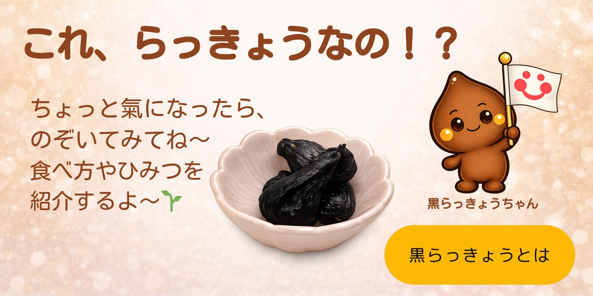 黒らっきょうのことや商品、食べ方、催事のお知らせなどが見られるよ。